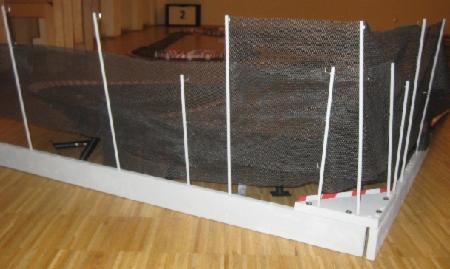 Eine 90x20 mm Dachlatte mit einem Bohrungsabstand von 300 mm wird seitlich an der Tischkante mit Schraubzwingen befestigt. In die Bohrungen werden Haltemasten aus 6 mm-Rundholz eingesteckt, an denen das Fangnetz eingehängt wird.
