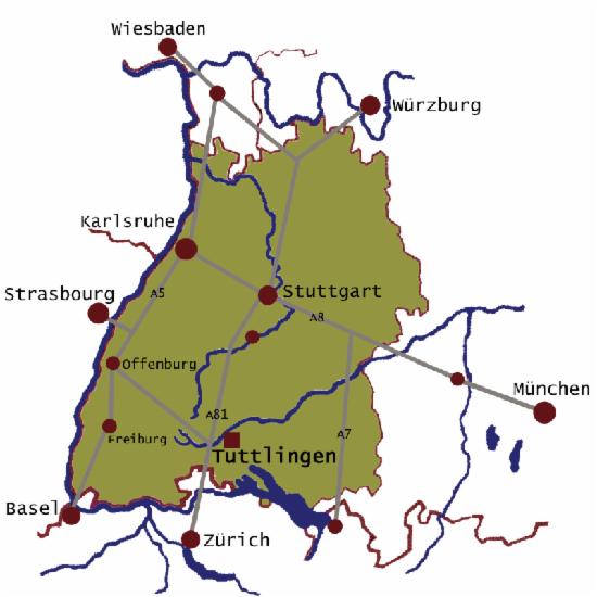 Tuttlingen liegt auf der Hegau-Alb, 15km östlich der Autobahn A81, nördlich der Schweizer Grenze und südlich von Stuttgart.